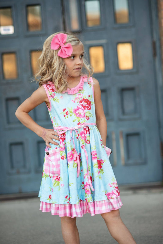 Kids Pink & Blue Floral Gingham Check Pocket Ruffle Dress