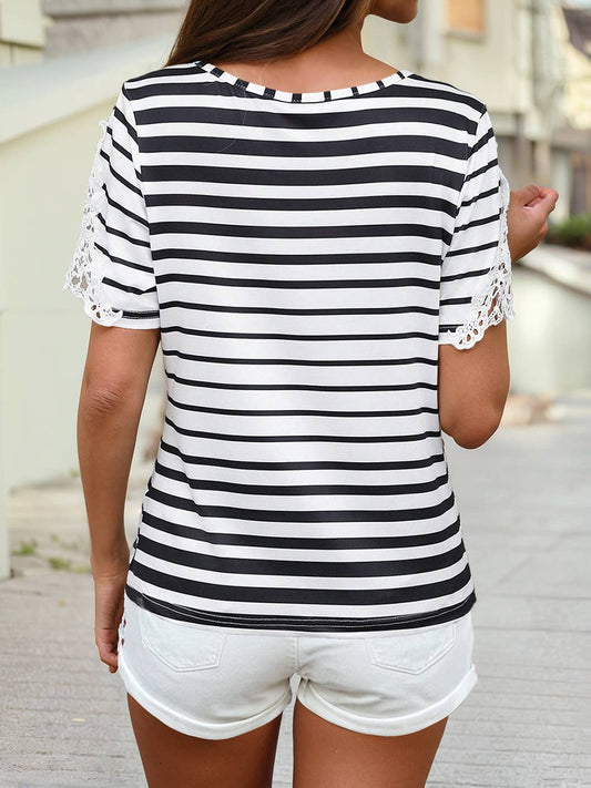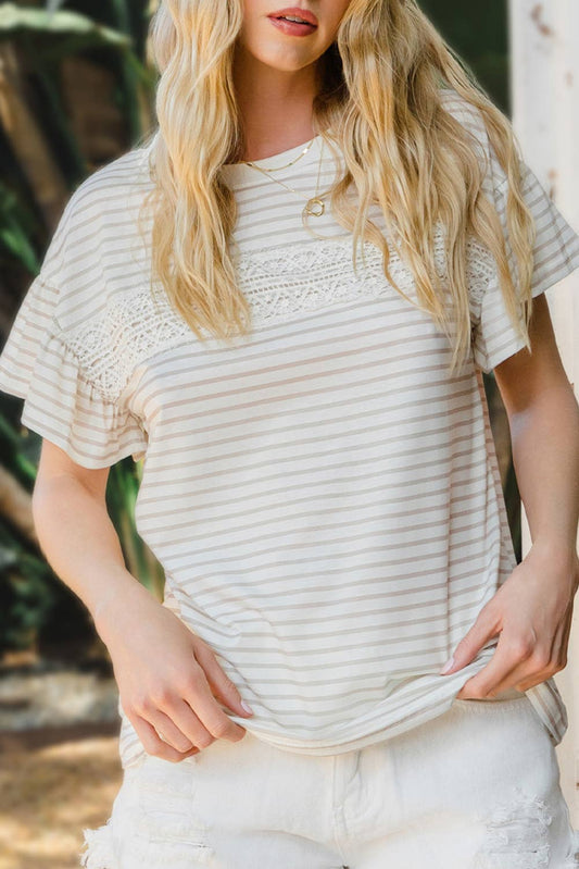 Women Striped Lace Splicing Ruffle Sleeve T-shirt