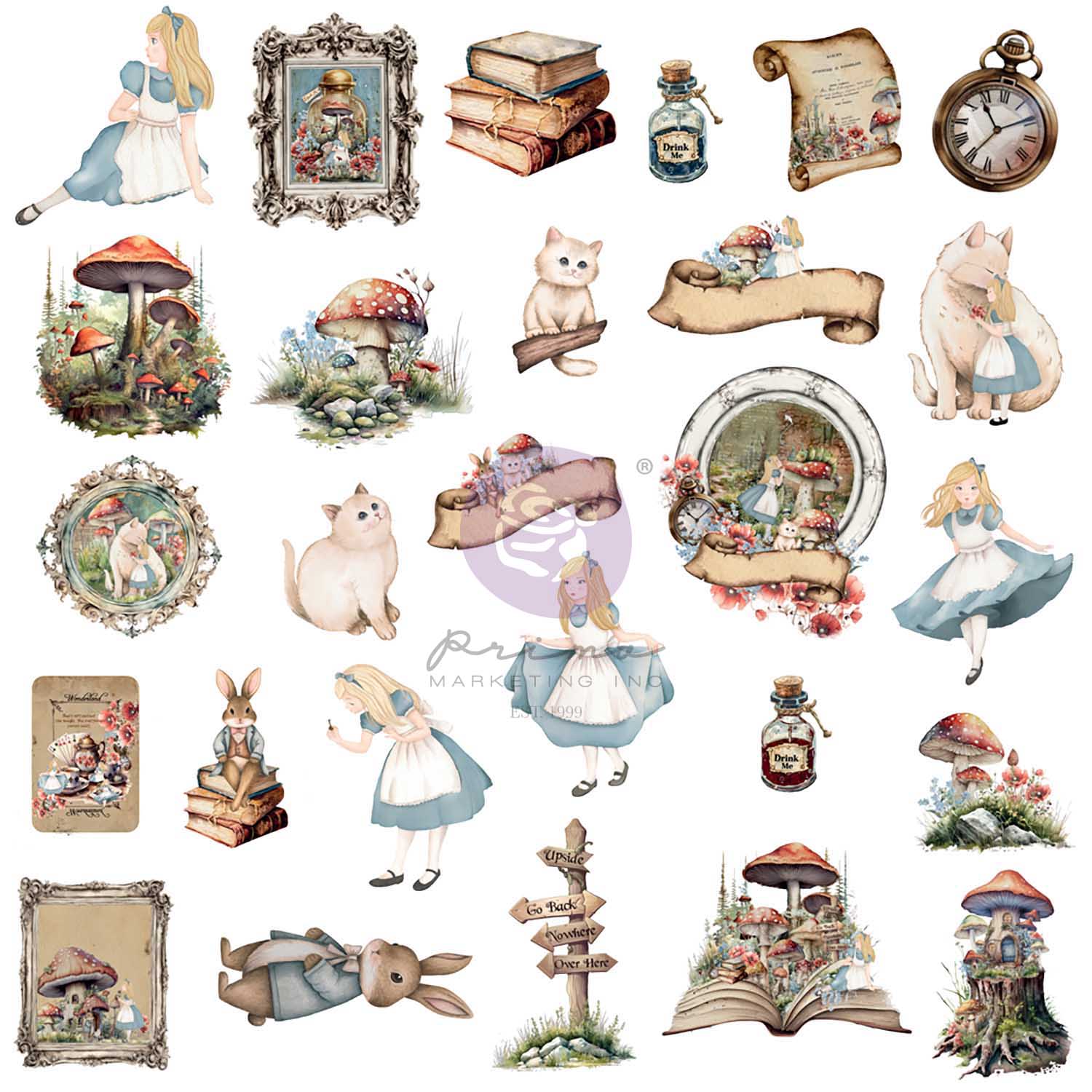 The Wonderland Keepsakes Ephemera set is filled with 54 hand-painted pieces that feel like they came straight out of a vintage storybook. From Alice and the rabbit to storybook cats, clocks, mushrooms, and banners, every detail captures the heart of the Return to Wonderland Collection by The 3 Girls Tale for Prima Marketing.